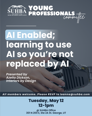 Young Professionals Committee Meeting Images Gallery Image × Set a Reminder Enter your email address below to receive a reminder message. Email address Select the amount of Days before the event -- Select Days Before Event -- 1 Day 2 Days 3 Days 1 Week Captcha Validation Please complete the Captcha Submit Date and Time Tuesday May 12, 2026 12:00 PM - 1:00 PM MDT Location SUHBA Office 301 N 200 E, Ste 2A St. George, Ut. 84770 Set a Reminder Enter your email address below to receive a reminder message. Email address Select the amount of Days before the event -- Select Days Before Event -- 1 Day 2 Days 3 Days 1 Week Captcha Validation Please complete the Captcha Submit Share × Print Email Add to Calendar Facebook Twitter LinkedIn Tell a Friend × Select Calendar Type × Google Yahoo iCal (Outlook, Apple, or other)